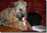 I dag har vi baket og laget jule middag. Når vi spiste jule middag fikk Happy lov til å åpne en jule gave, å det syntes Happy var kjempe gøy... Når vi var ferdig å spise fikk Happy åpne resten av gavene sine.. Han fikk et par forskjellige tygge bein og en grise snute.